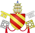 | 19. | Le comte Laurent | Innocent IV (1243–1254) | Sinibaldo Fieschi | De la maison Flisca (Fieschi), comte de Lavagna, cardinal de San Lorenzo in Lucina. Wion explique que la devise fait référence au père d'Innocent IV, le comte de Lavagna, et à son titre de cardinal-prêtre de la basilique San Lorenzo in Lucina[36],[37] | ![]() |