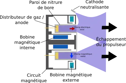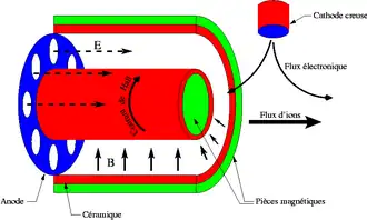 Un propulseur à effet Hall est constitué de deux cylindres en céramique imbriqués d'environ 10 cm de diamètre[15]. À l'intérieur du cylindre interne et à l'extérieur du cylindre externe on trouvera des bobinages. Ils servent à générer un intense champ magnétique radial dans la zone de sortie du propulseur. Au fond de l'espace intra-cylindrique se trouve une anode avec le système d'injection du gaz. Une cathode creuse se situe à l'extérieur des cylindres. La pointe centrale forme un des pôles de l'électroaimant entouré par un espace annulaire, puis par la partie extérieure de l'électroaimant.