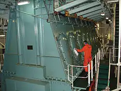 • Le moteur Diesel quatre-temps : Il tourne à vitesse intermédiaire (400-800 tr/min) ou élevée (>1 000 tr/min) et nécessite un réducteur pour diminuer le régime (la vitesse de rotation) de l'hélice. Il offre une plus grande flexibilité mais est moins efficace qu'un moteur deux-temps et consomme plus (220 kg/MWh). Sa taille plus petite permet l'implantation de plusieurs moteurs, ce qui est utile pour assurer une certaine redondance et mieux gérer les pannes. Ces moteurs sont aussi utilisés pour la production électrique sur la plupart des navires (groupe électrogène). La puissance maximale par moteur est de l'ordre de 28 MW. Le rapport poids/puissance d'un Diesel semi-rapide est de 12 à 18 kg/kW, et de 2,5 à kg/kW pour un Diesel rapide.