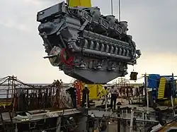 Un moteur Diesel en train d'être installé sur l'USCGC Bertholf