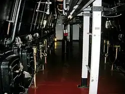 Schéma de la machine à vapeur du Deutschland ; les traits horizontaux représentent les ponts et donnent une idée de la taille de l'ensemble.