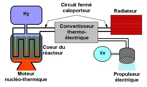 - La chaleur dégagée par une réaction de fission nucléaire est utilisée pour produire de l'électricité qui peut elle-même être utilisée par une propulsion spatiale électrique et/ou les équipements de l'engin spatial. Cette technique a été utilisée par la série de radars de reconnaissance soviétiques RORSAT (générateur BES-5) lancés entre 1967 et 1988. Deux réacteur TOPAZ plus puissants ont été également testés dans l'espace à la fin des années 1980. Les États-Unis ont testé dans l'espace un réacteur fonctionnant selon le même principe en 1965 : le SNAP-10A qui produisait 500 watts électriques.