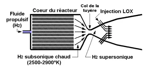 - Dans la propulsion nucléaire thermique l'énergie dégagée par un réacteur à fission nucléaire chauffe un fluide propulsif (généralement de l'hydrogène liquide) éjecté par une tuyère. Ce type de propulsion n'a jamais été mis en œuvre dans l'espace mais des moteurs ont été testés sur Terre. Le plus connu est le moteur américain NERVA qui produisait une poussée comprise entre 250 et 350 kilonewtons et qui été testé entre 1964 et 1969. Les soviétiques ont de leur côté développé le moteur-fusée RD-0410 entre 1965 et les années 1980.
