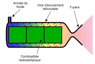 Le concept est un développement du générateur thermoélectrique à radioisotope (RTG), qui produit de l'électricité à partir de la chaleur radioactive. Pour la propulsion, le système de conversion électrique est remplacé par un échangeur dans lequel circule le fluide à chauffer. Les températures atteignables vont de 1 500 à 2 000 °C, permettant une impulsion spécifique de 700 à 800 s, environ le double des performances du meilleur système de propulsion chimique (LOX/LH2).