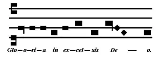 Les périodes de la composition de la Gloria in excelsis Deo en tant que chant monodique variaient énormément. Nonobstant, selon les mélodies enregistrées à partir du IXe siècle grâce aux neumes, toutes les Gloria dans le graduel romain du Saint-Siège respectent toujours la structure en prose, quelle que soit la période de composition : de la Gloria XV au Xe siècle jusqu'à la Gloria VIII (à droite) au XVIe siècle[6].