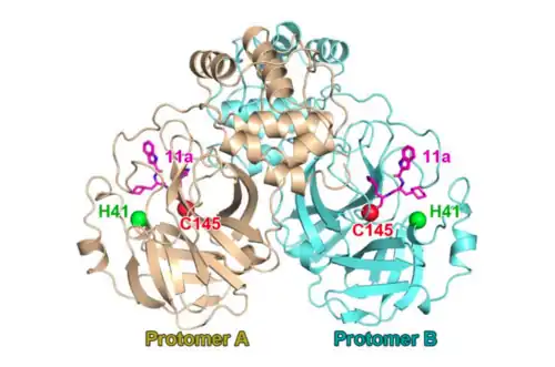 Le site de liaison au substrat (la molécule qui va être clivée) de chaque monomère est situé dans une cavité profonde, formée par deux tonneaux β comme dans la chymotrypsine, entre les domaines II et III. Le site actif catalytique est situé au centre de cette cavité[7], il est formé par un résidu d'acide aminé histidine situé en 41e position (His41) de la chaîne protéique et un résidu de cystéine situé en 145e position (Cys145)[8]. Contrairement à la chymotrypsine, il n'a pas été découvert de troisième résidu intervenant dans l'activité catalytique, il s'agit donc d'une dyade et non d'une triade catalytique. Une molécule d'eau est liée par une liaison hydrogène au résidu His41, cette molécule d'eau pourrait jouer le rôle habituellement tenu par le troisième résidu catalytique (acide aspartique) de la triade des protéases à sérine[9].