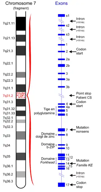 On estime actuellement que le gène FOXP2 occupe au moins 280 kb (280 000 paires de bases) sur le chromosome 7[7]. D'autres publications de 2007 indiquent un nombre de paires de 603 kb[8]. Indépendamment de cela, une très grande proportion de paires de bases constitue des introns, c'est-à-dire des parties non fonctionnelles pour la synthèse de la protéine. 17 exons codants la protéine ont été localisés[9].