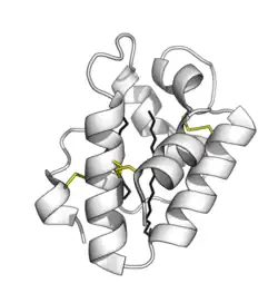 Les protéines de transfert des lipides des plantes partagent le même domaine structural [58] que les protéines de stockage des graines [59] et les inhibiteurs de la trypsine alpha-amylase[60],[61] Ces protéines partagent le même faisceau de quatre hélices stabilisé au disulfure superhélique contenant une cavité interne.