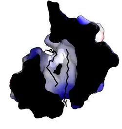 - Les PTL 1 disposent dans leur région centrale d'une cavité hydrophobe flexible formant un minuscule tunnel à 2 entrées (une petite et une large). Ce tunnel est hydrophobe parce que constitué de plusieurs résidus à chaînes latérales hydrophobes (notamment alanine, isoleucine, leucine, proline et valine)[10],[11]. Deux acides aminés électropositifs (arginine et lysine) sont situés au voisinage de la plus grande entrée, interagissant avec les parties hydrophiles des lipides. La partie hydrophile des acides gras reste exposée au solvant et leur partie hydrophobe est aspirée dans le tunnel.