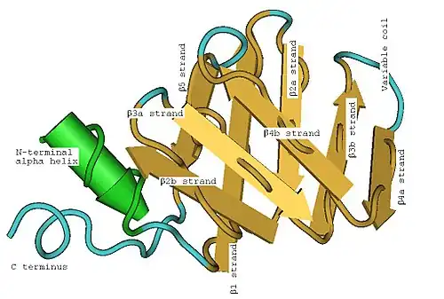 La structure secondaire d'une protéine LSm est un feuillet de cinq brins anti-parallèles β, avec les brins identifiés à partir de l'extrémité N-terminale vers l'extrémité C-terminale par β1, β2, β3, β4, β5. La séquence de motifs Sm1 correspond aux brins β1, β2, β3 et la séquence Sm2 correspond aux brins β4 et β5. Les quatre premiers brins β sont adjacents entre eux, mais β5 est adjacent à β1, transformant la structure d'ensemble en un court cylindre. Cette topologie structurelle est décrite comme 51234. De courte longueur (deux à quatre tours de spire) l'hélice α N-terminale est également présente dans la plupart des LSm. Les brins β3 et β4 sont courts dans certaines LSm et séparés par un portion non structurés de longueur variable. Les brins β2, β3 et β4 sont courbés à 120° en leur milieu, les coudes correspondant souvent à la présence de glycine et les chaînes latérales internes au cylindre à des résidus hydrophobes: valine, leucine, isoleucine et méthionine.