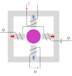 Le courant crée un moment qui déclenche le relais, la tension un moment qui empêche le déclenchement du relais[8]: