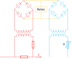 Le dispositif à pont de Graetz, dispose d'une résistance réglable (voir ci-contre). Le relais déclenche quand :