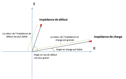 L'impédance est donc ici en valeur absolue plus faible en cas de défaut. L'angle est beaucoup plus élevé[5].