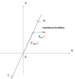Si l'impédance de l'arc électrique est négligée, l'impédance de défaut se trouve sur la droite , la distinction est alors aisée. L'impédance des arcs n'est cependant pas toujours négligeable, elle est considérée comme étant purement résistive et dépend à la fois de sa longueur et de son courant[14]. Ces paramètres ne pouvant être déterminés à l'avance, la résistance d'arc est une inconnue. Sur une ligne électrique longue l'effet des arcs électriques peut normalement être négligé, mais pas sur les lignes courtes avec un courant de défaut faible[13].