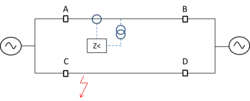 Par ailleurs, les générateurs électriques, quand ils se synchronisent au réseau, font augmenter subitement le courant et donc diminuer l'impédance lue. On parle aussi de « pompage »[15]. Un relais peut prendre une oscillation de puissance pour un défaut multi-phases[16]. La caractéristique doit être choisie de manière que cet état transitoire ne provoque pas de déclenchement[6].