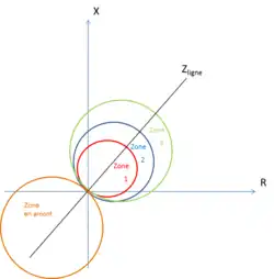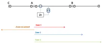 La zone 3 sert de secours pour la zone adjacente. Elle doit donc couvrir cette dernière autant que possible[6]. On utilise aussi fréquemment une zone arrière qui permet à la protection de surveiller les défauts en amont de la ligne.