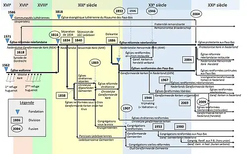 À la suite des nombreuses divisions qui se sont produites au cours du temps, il existe aujourd'hui aux Pays-Bas à une dizaine de petites unions d'églises d'inspiration calviniste conservatrice, parmi lesquelles :