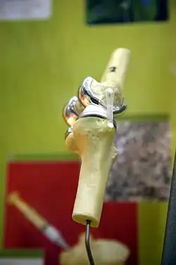 - l'usure de la prothèse (plus précisément du polyéthylène). Chez les personnes âgées de moins de 50 ans au moment de la pose, un peu plus d’1/5 aura besoin d'une nouvelle prothèse au cours de sa vie[9].