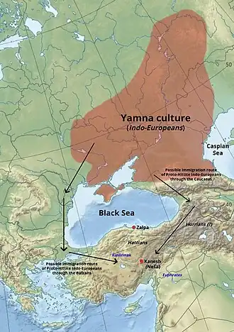 Expansion indo-européenne selon l'hypothèse kourgane : 1 (noir) : Langues anatoliennes (PIE archaïque). 2 (noir) : Culture Afanasievo (PIE précoce). 3 (noir) : Expansion de la culture Yamnaya (steppe pontique-caspienne, vallée du Danube) (PIE tardif). 4A (noir) : Culture de la céramique cordée. 4B-C (bleu et bleu foncé) : Bécher à clochettes adopté par les locuteurs indo-européens. 5A-B (rouge) : Céramique cordée de l'Est. 5C (rouge) : Sintashta (proto-indo-iranien). 6 (magenta) : Andronovo. 7A (violet) Indo-Aryens (Mittani). 7B (violet) : Indo-Aryens (Inde). [sn] (jaune foncé) : proto-balto-slave. 8 (gris) : Grec. 9 (jaune) : Iranien. [non représenté] : Arménien, en expansion depuis la steppe occidentale.