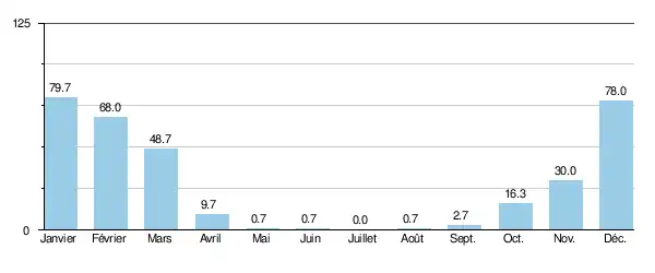| Précipitations (mm) | 79,7 | 68 | 48,7 | 9,7 | 0,7 | 0,7 | 0 | 0,7 | 2,7 | 16,3 | 30 | 78 | 335 |