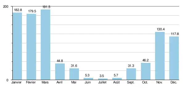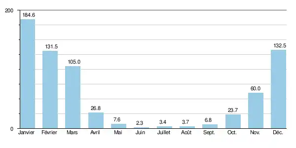 | Précipitations (mm) | 182 | 162,9 | 118,3 | 36,6 | 8,6 | 2,6 | 3,5 | 4,2 | 6,6 | 26,1 | 65,3 | 138 | 754,7 |