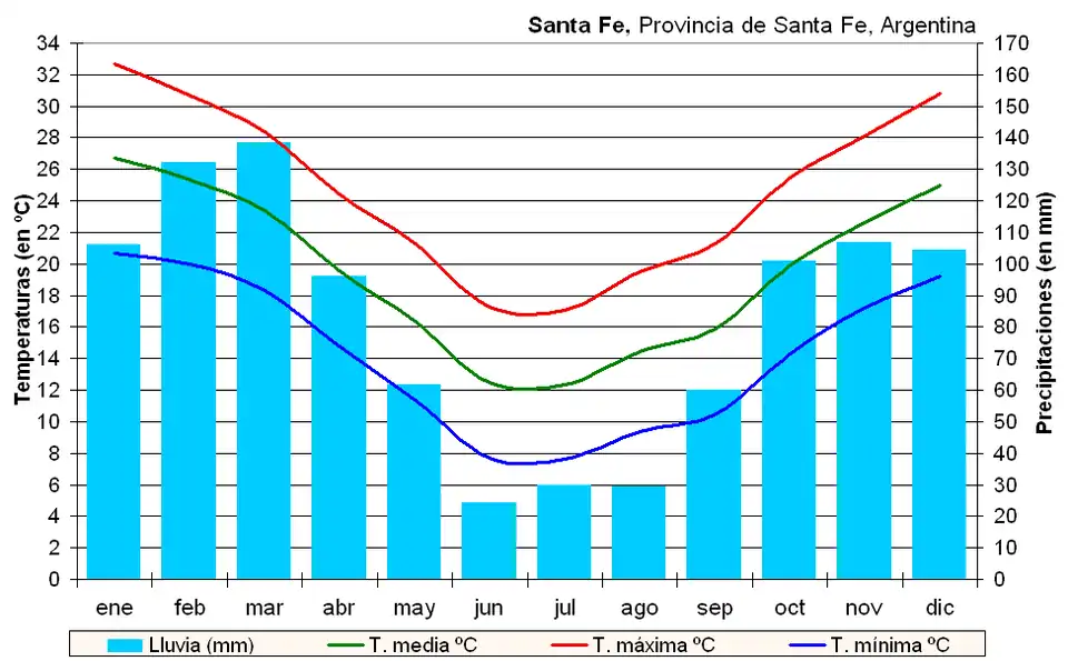 La température moyenne de la ville de Santa Fe, atteint 18,5 °C, ce qui est vraiment beaucoup plus chaud que les 10,8 °C de Paris, 10,5 °C de Genève, 10,4 °C de Bruxelles, soient des températures beaucoup plus basses. On voit ainsi que la ville et sa région bénéficient d'un climat subtropical chaud. En réalité le climat de la ville soutient largement la comparaison avec la ville française de Nice (moyenne annuelle de 16,0 °C) ou italienne de Rome (15,5 °C).