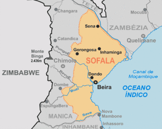La province de Sofala, au centre-est du Mozambique, couvre une superficie de 68 018 km2. La province est bordée au nord par la province de Tete, au nord-est par la province de Zambézie, au sud par la province d'Inhambane, et à l'ouest par la province de Manica. Les fleuves qui traversent la province comprennent le Chiveve, la rio Búzi, le Savé, qui coule le long de la frontière provinciale d'Inhambane, et le Pungue, qui se jette dans la mer à Beira. Sur le fleuve Urema (en), un affluent du Púnguè, la rivière forme une lagune qui abrite des centaines d'hippopotames[8]. Les vallées de la province sont sujettes aux inondations ; fin janvier 2012, des pluies exceptionnellement fortes ont provoqué des inondations généralisées le long des rives du Púnguè et de la Save, ainsi que d'autres grands fleuves d'Afrique tels que le Zambèze et le Limpopo, entraînant l'évacuation de plus de 100 000 personnes au total[9].