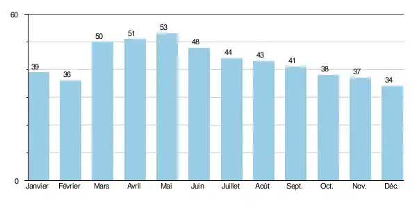 | Précipitations (mm) | 39 | 36 | 50 | 51 | 53 | 48 | 44 | 43 | 41 | 38 | 37 | 34 | 514 |