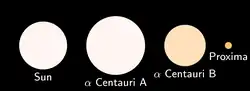 - ↑ Un simple calcul de proportion indique que, si le Soleil avait la taille d'une orange de 10 centimètres de diamètre, Proxima Centauri se situerait à environ 2 810 kilomètres (calcul à partir de la valeur 4,24 al), et la Terre à 10 mètres de notre étoile.