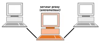Représentation schématique d'un serveur proxy où l'ordinateur placé au milieu agit comme intermédiaire entre deux autres ordinateurs.