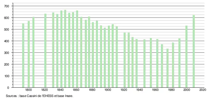 - ↑ Par convention dans Wikipédia, le principe a été retenu de n’afficher dans le tableau des recensements et le graphique, pour les populations légales postérieures à 1999, que les populations correspondant à une enquête exhaustive de recensement pour les communes de moins de 10 000 habitants, et que les populations des années 2006, 2011, 2016, etc. pour les communes de plus de 10 000 habitants, ainsi que la dernière population légale publiée par l’Insee pour l'ensemble des communes.