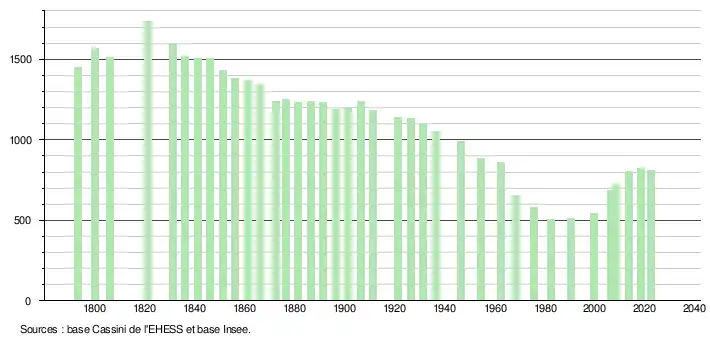 L'évolution du nombre d'habitants est connue à travers les recensements de la population effectués dans la commune depuis 1793. Pour les communes de moins de 10 000 habitants, une enquête de recensement portant sur toute la population est réalisée tous les cinq ans, les populations de référence des années intermédiaires étant quant à elles estimées par interpolation ou extrapolation[15]. Pour la commune, le premier recensement exhaustif entrant dans le cadre du nouveau dispositif a été réalisé en 2008[16].