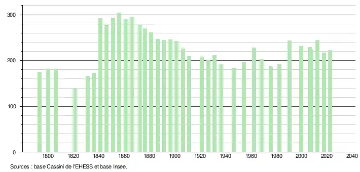 L'évolution du nombre d'habitants est connue à travers les recensements de la population effectués dans la commune depuis 1793. Pour les communes de moins de 10 000 habitants, une enquête de recensement portant sur toute la population est réalisée tous les cinq ans, les populations de référence des années intermédiaires étant quant à elles estimées par interpolation ou extrapolation[18]. Pour la commune, le premier recensement exhaustif entrant dans le cadre du nouveau dispositif a été réalisé en 2007[19].