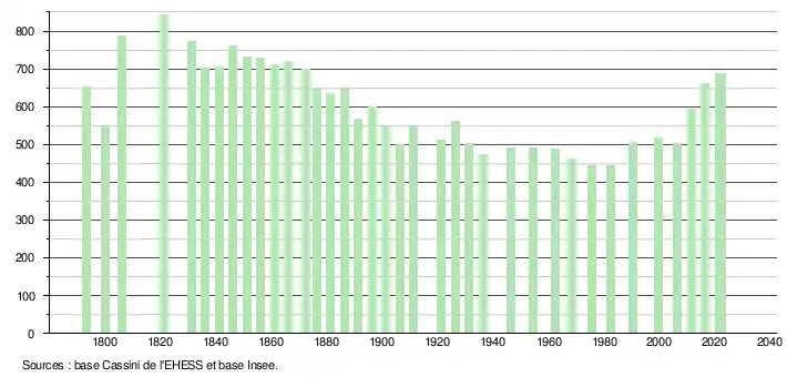 L'évolution du nombre d'habitants est connue à travers les recensements de la population effectués dans la commune depuis 1793. Pour les communes de moins de 10 000 habitants, une enquête de recensement portant sur toute la population est réalisée tous les cinq ans, les populations de référence des années intermédiaires étant quant à elles estimées par interpolation ou extrapolation[14]. Pour la commune, le premier recensement exhaustif entrant dans le cadre du nouveau dispositif a été réalisé en 2006[15].