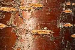 L'écorce est lisse, de couleur grisâtre ou rougeâtre.