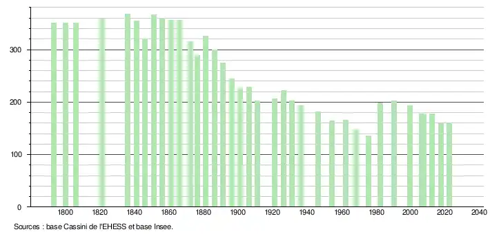 L'évolution du nombre d'habitants est connue à travers les recensements de la population effectués dans la commune depuis 1793. Pour les communes de moins de 10 000 habitants, une enquête de recensement portant sur toute la population est réalisée tous les cinq ans, les populations de référence des années intermédiaires étant quant à elles estimées par interpolation ou extrapolation[15]. Pour la commune, le premier recensement exhaustif entrant dans le cadre du nouveau dispositif a été réalisé en 2007[16].