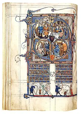 Le programme iconographique est très riche et ambitieux, mais est inachevé lui aussi, n'occupant que les 90 premiers folios. À partir du folio 91r, les peintures sont simplement ébauchées, sans détails, à partir du folio 107, ils ne contiennent plus que le dessin à la plume, normalement sous-jacent. À partir du folio 112v, il ne reste que les espaces laissés vides pour les enluminures prévues. Cette décoration consiste tout d'abord en une grande miniature en pleine page représentant l'arbre de Jessé. Puis, on compte 11 grandes lettrines historiées occupant presque une page complète, à chaque grand chapitre du texte[2].