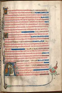 Le manuscrit contient 131 folios et il manque sans doute 19 folios qui ont été détachés à une période indéterminée. Les psaumes sont alternativement écrits en latin et en français. Le latin se trouve sur la page de gauche, écrit dans une encre de couleur noir, tandis que le français se trouve sur la page de droite, en rouge. Les psaumes en latin sont décorés de scènes de bas de page illustrant l'Ancien Testament, alors que ceux en français sont décorés de scènes du bestiaire et de motifs héraldiques. Le début des principales divisions du psautier sont marquées par des grandes lettrines historiées et des scènes de bas de page racontant les épisodes de la vie de David. Il ne reste cependant que 9 des 20 folios d'incipits qui devaient exister à l'origine. Le manuscrit contient par ailleurs 238 lettrines et bas de page illustrant l'Ancien Testament, de la Genèse au tout début de l'histoire de David. Les épisodes évoqués rappellent ceux déjà présents dans les bibles moralisées de l'époque. Le texte en français contient de son côté des lettrines décorées de blasons et des scènes de bas de page avec un bestiaire pour les 77 premiers psaumes. Certains animaux semblent associés à des psaumes spécifiques : ils renvoient ainsi à des qualités morales mises en valeur par le livre. Il s'agit d'un des très rares livres à effectuer une telle association entre psaume et animaux. Il ne se retrouve par la suite que dans le psautier de la reine Marie[3].