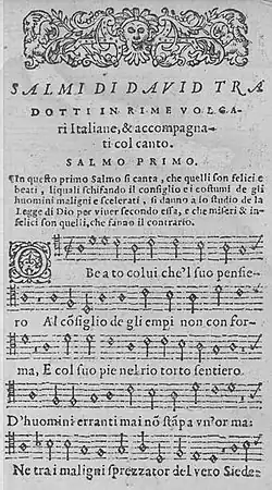 François Perrot, un huguenot français au nom italianisé en Francesco Perroto, avait longtemps séjourné en Italie et publié en italien tout un ensemble d’œuvres littéraires et religieuses[15]. Il publia en 1581 une traduction partielle du Psautier de Genève limitée à 75 psaumes :