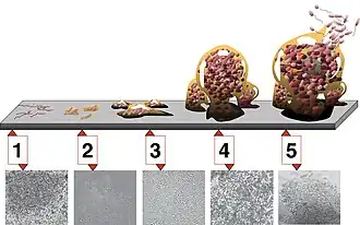 P. aeruginosa, comme certaines autres bactéries gram-négatives, se développe sous forme d'agrégats structurés appelés biofilms[49], où ses cellules sont enrobées d'une matrice composée de polymères extracellulaires complexes. Ces biofilms forment une barrière physique contre l'entrée d'agents antimicrobiens[50],[49], et sont partiellement responsables des infections des poumons persistantes par P. aeruginosa chez les patients immunocompromis atteints de mucoviscidose[50],[51],[52],[53]. La formation du et par le biofilm est contrôlée par des signaux de cellule-à-cellule, et des mécanismes contrôlés par le quorum sensing[54],[51],[55],[56],[57] basés sur la notion de « perception du quota » (quorum sensing) et de « masse critique » : la nature et donc la fonction des molécules signalant les échanges de cellule-à-cellule changent à partir d'une concentration donnée des bactéries. Les bactéries présentes dans un biofilm sont moins actives métaboliquement, donc moins réceptives aux agents antimicrobiens[58] et aux disruptions environnementales[49]. Le biofilm joue un rôle actif dans le processus de communication entre cellules bactériennes.