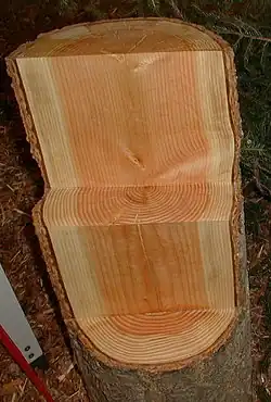 Le duramen du douglas est de couleur brun rosé tandis que l'aubier est de couleur jaune brun clair. Le bois est à fil droit, avec des cernes larges (du fait de sa croissance rapide) , une texture forte (grande proportion de bois final). Au sein d'un même cerne annuel, il existe une hétérogénéité de couleur et de structure, due au diamètre différent des vaisseaux du bois, entre le bois initial (bois de printemps), le bois intermédiaire et le bois final (bois d'été). Les canaux résinifères normaux ne sont pas toujours bien visibles[21]. La présence de petits canaux résinifères localisés provoque une odeur résineuse prononcée quand le bois est fraîchement coupé, et s'estompe quand le bois sèche.