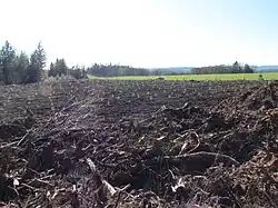 Jeune plantation d'une forêt industrielle après une coupe rase et un labour profond (Corrèze, France)