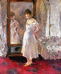 L'artiste peintre française Berthe Morisot a créé plusieurs scènes de femme à sa toilette. Le tableau ci-contre, daté de 1876, est exposé au musée Thyssen-Bornemisza à Madrid[2]. Il mesure 65 × 54 cm.