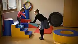 Albiana avec Sandrine à une séance de psychomotricité. Image du film de Fernand Melgar " À l'école des Philosophes".