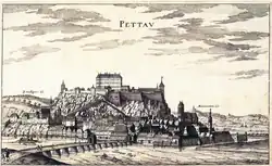 Au Ve siècle, les Huns pillèrent et détruisirent la ville. Après la chute de l'Empire romain, la région fut peuplée par les Avars puis par des tribus slaves. Au Moyen-Âge central, Ptuj se retrouve dans la ceinture des marches du sud-est du Saint-Empire et sous la domination des archevêques de Salzbourg ; leurs ministériels luttèrent contre les envahisseurs hongrois. L'archevêque Conrad Ier († 1147) a fini la bataille et fit construire un château fort à Ptuj pour assurer l'intégrité de la frontière impériale. De nombreux citoyens s'installèrent au niveau du passage de la Drave. En 1376, Ptuj reprend ses droits municipaux ; les privilèges ont été confirmés par l'empereur Frédéric III en 1458. Toutefois, les troupes hongroises de Mathias Corvin occupèrent la ville de 1479 jusqu'à la mort du roi en 1490.