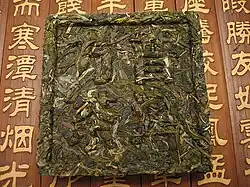 Carré plat de thé, de 100 g ou 200 g. Des empreintes de sinogrammes en relief sont souvent obtenus par pression sur le dessus.