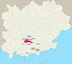 La commune, à l'ouest de la forêt du massif des Maures, est composée de hameaux : la Foux, le Canadel, la Ruol (basse et haute), Les Ferrières, le Mas de Brun, la Haute Ville, le Mas de Blanc, le Mas de Caudière ainsi que de lieux-dits dans la plaine comme sur la colline.