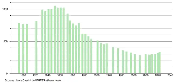 L'évolution du nombre d'habitants est connue à travers les recensements de la population effectués dans la commune depuis 1793. Pour les communes de moins de 10 000 habitants, une enquête de recensement portant sur toute la population est réalisée tous les cinq ans, les populations de référence des années intermédiaires étant quant à elles estimées par interpolation ou extrapolation[26]. Pour la commune, le premier recensement exhaustif entrant dans le cadre du nouveau dispositif a été réalisé en 2005[27].