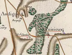 La carte de Cassini ci-contre montre qu'au milieu du XVIIIè siècle, Puisieux est une paroisse avec un château dont le seigneur possède les bois situés à l'ouest, traversés par de nombreuses allées rectilignes. Ce château est aujourd'hui un gîte et chambres d'hôtes.