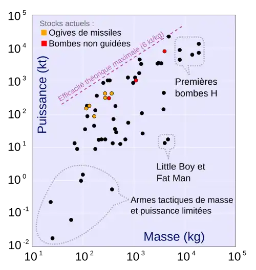 - Étant donné que le ratio maximum théorique est d'environ 6 mégatonnes de TNT par tonne, et que le ratio maximum atteint était apparemment de 5,2 mégatonnes de TNT par tonne, il existe une limite pratique sur la puissance des armes air-sol. Les armes de dernière génération n'ont plus la très lourde enveloppe que l'on croyait nécessaire pour que les réactions nucléaires se produisent de manière efficace - ce qui a considérablement accru le ratio puissance/masse. Par exemple, la bombe Mk-36 telle que construite avait un ratio de 1,25 mégatonne de TNT par tonne. Si l'enveloppe de la Mk-36 qui pesait 5,5 t avait été réduite des deux tiers, le ratio puissance/masse aurait été de 2,3 mégatonnes de TNT par tonne, soit ce qui est atteint une génération d'armes plus tard, comme pour la beaucoup plus légère bombe B53 (de 9 Mt).